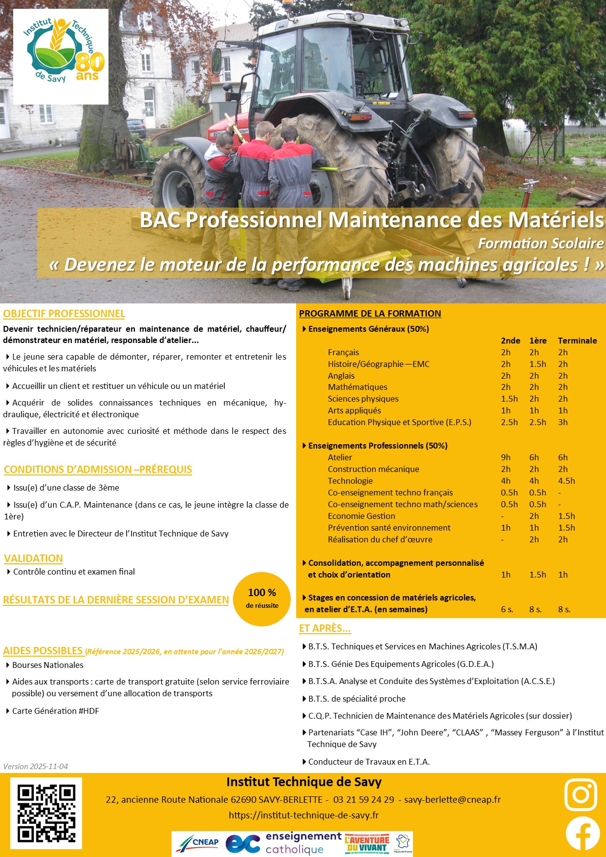- Les 4000m2 d’ateliers dédiés à la formation permettent d’acquérir les compétences en maintenance et réglages des matériels : électricité et diagnostic, motorisation, hydraulique et transmissions